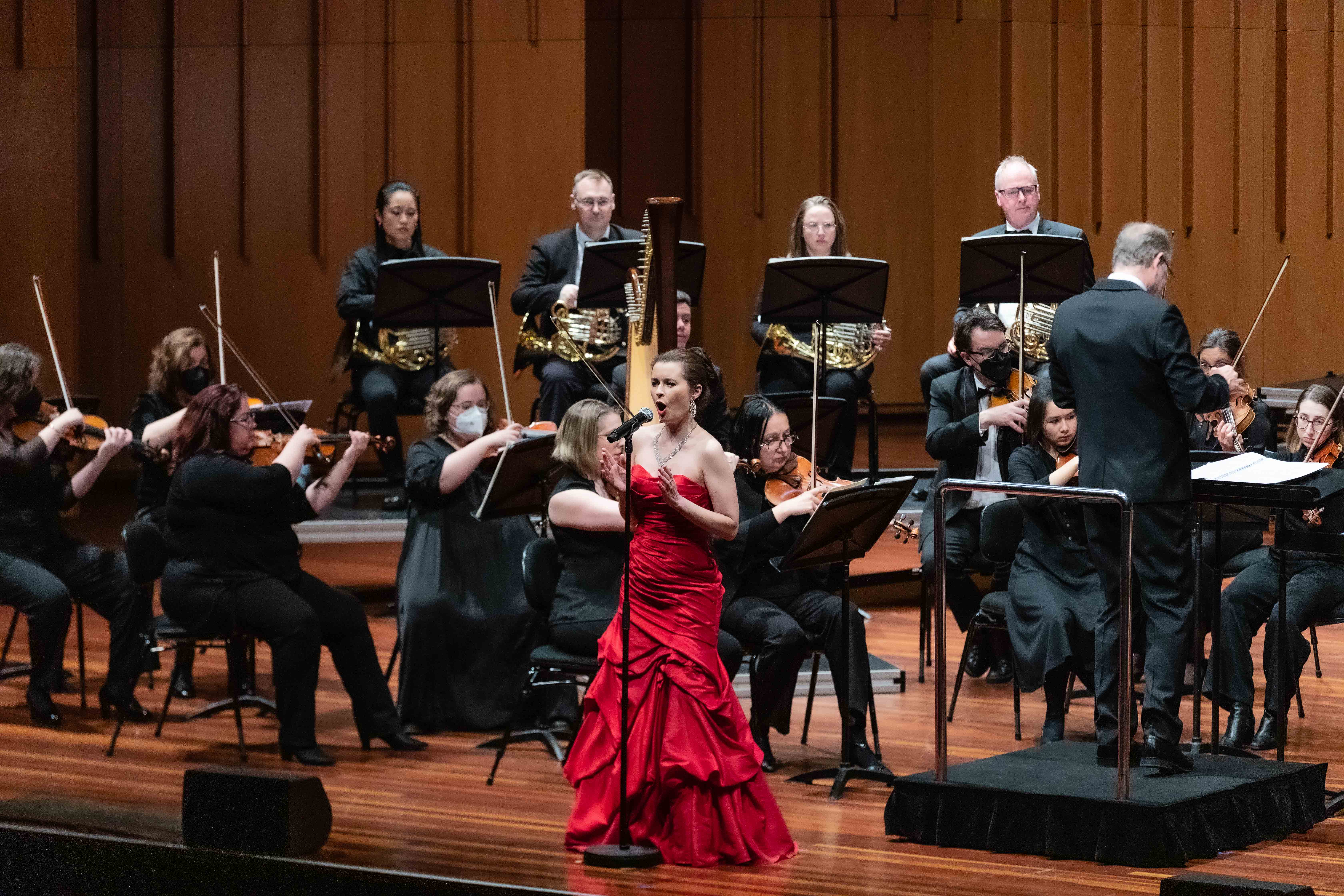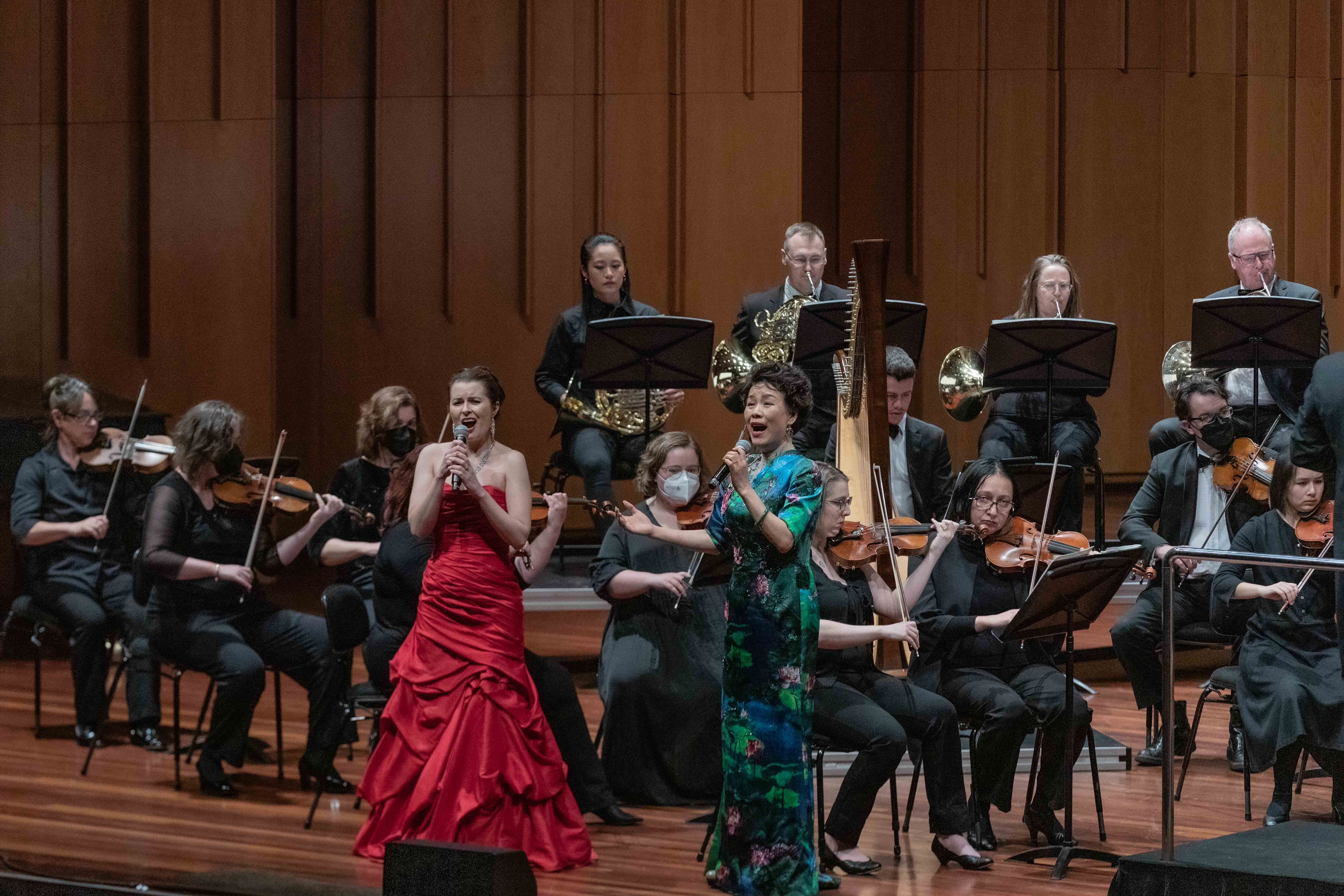 7月30日,在澳大利亚首都堪培拉“中华风韵”交响音乐会上,中国女高音歌唱家雅芬(前右)与澳大利亚女中音歌唱家维多利亚·兰伯恩合作演绎《枉凝眉》。(新华社)