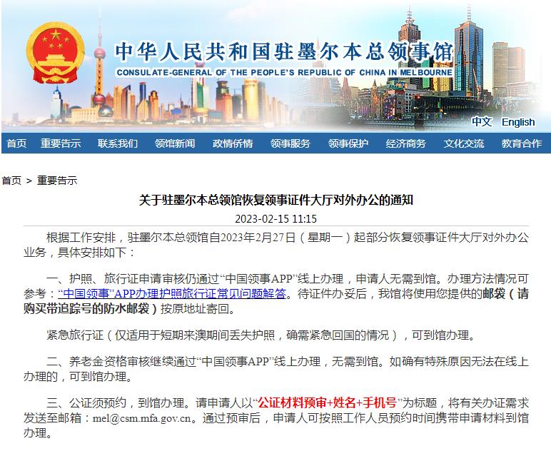据中国驻墨尔本总领事馆网站消息,根据工作安排,驻墨尔本总领馆自2月27日起部分恢复领事证件大厅对外办公业务,具体安排如下: