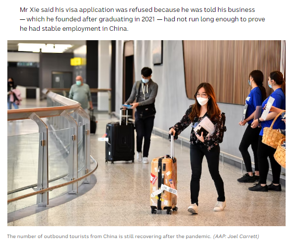 谢先生被告知的拒绝理由是,他的企业(在他2021年毕业后创办)经营时间不够长,无法证明他在中国有稳定的工作。尽管他的创业公司相对较新,但谢先生表示,他向澳当局提供了一份3个月的银行账单,显示他的账户里有70多万元人民币,以证明他真的计划去澳洲度假。