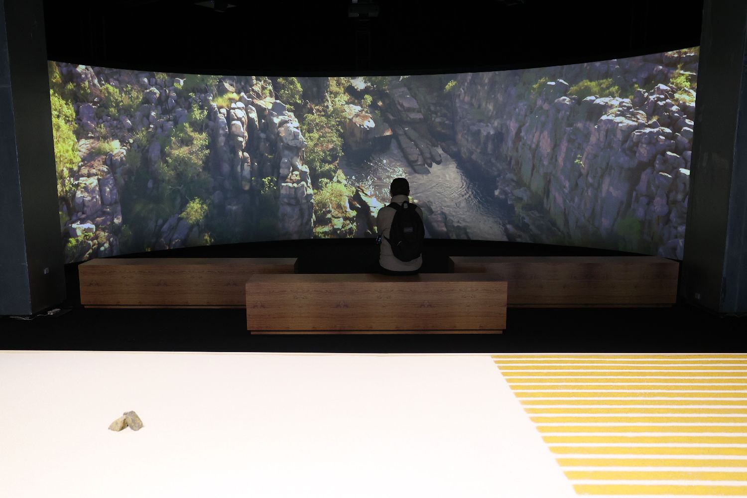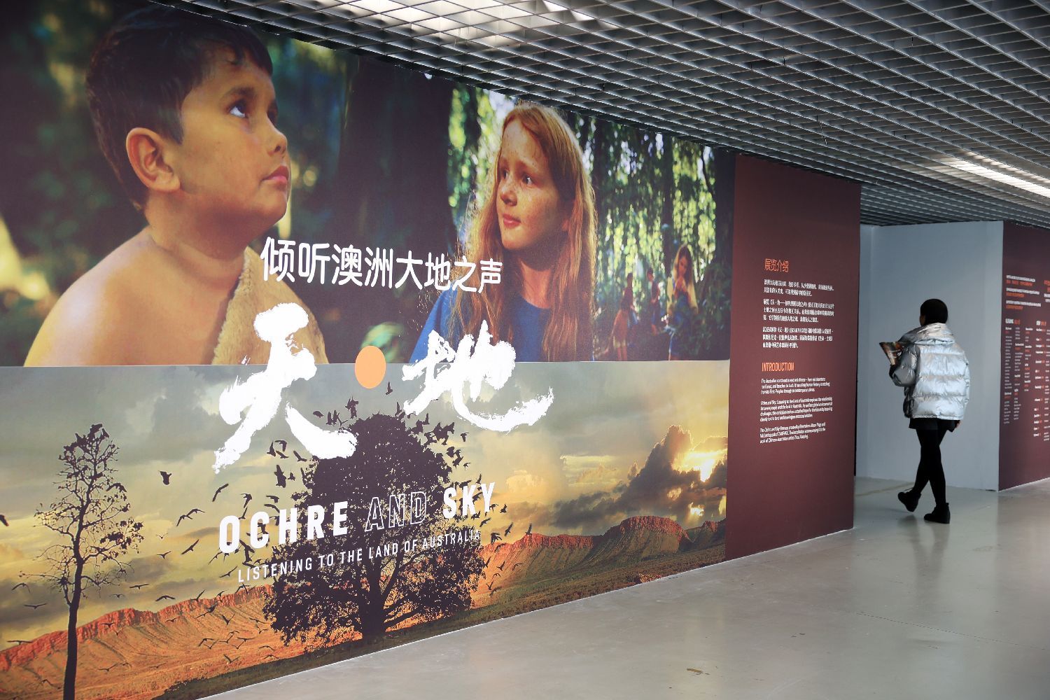 2023年11月15日,参观者走进展厅欣赏展出的展览。当日,《天∙地——倾听澳洲大地之声》在中华世纪坛艺术馆开展。(图/黎想摄)