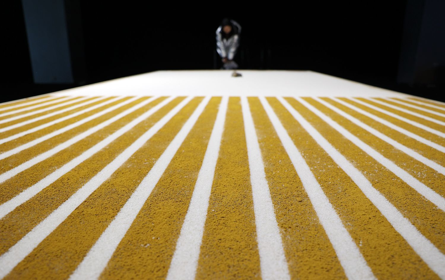 走进展区,400公斤的大米静躺在展区中央,上面点缀着岩石和赭色粉末铺就的线条。