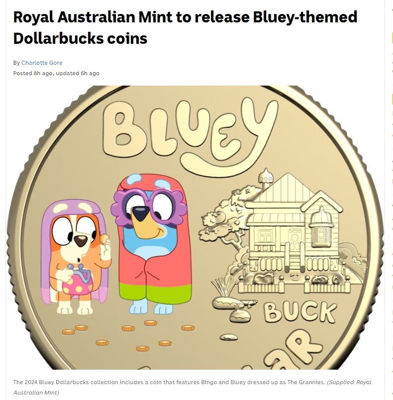 作为一部脍炙人口的澳洲经典儿童动画片《布鲁伊(Bluey)》的主角,牧羊犬布鲁伊的形象现在出现在硬币上面了!