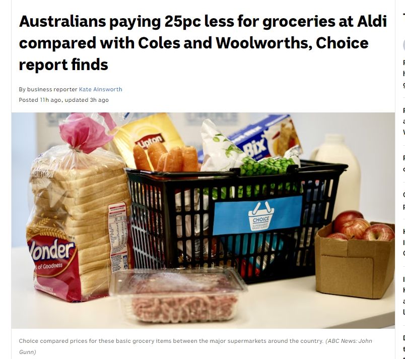通过比对价格后,Choice发现,在Aldi购买的食品杂货平均价格为51.51元,比Coles和Woolworths的同类商品便宜约25%。