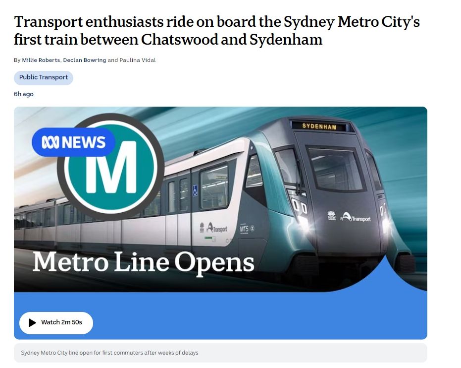 对此,新州州长明斯(Chris Minns)表示,新的地铁线路的正式开通,是悉尼的“巨大变化,也是其交通网络的一大进步”。