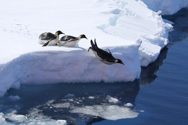 资料图:2019年12月6日,3只帝企鹅在围观“雪龙2”号约半小时后跳入海中。