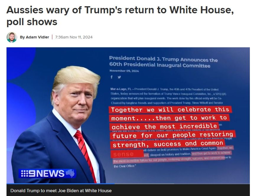 此外,在美国大选后的民意调查发现,54%的澳大利亚人对特朗普持负面看法,而26%的则人持正面看法。至于被被击败的对手哈里斯(Kamala Harris),受到41%的受访者的喜爱。