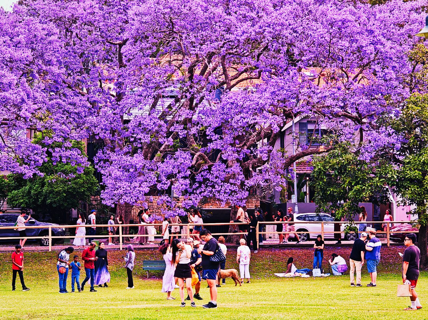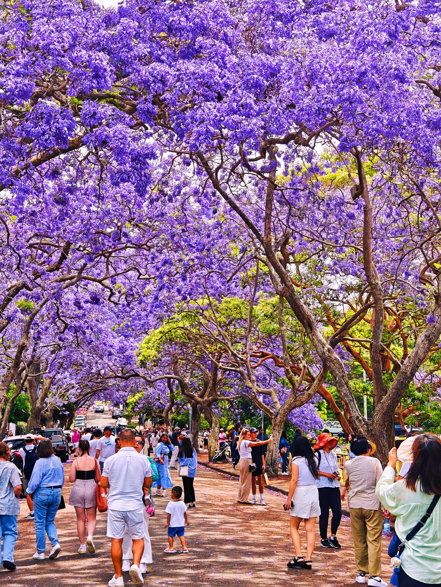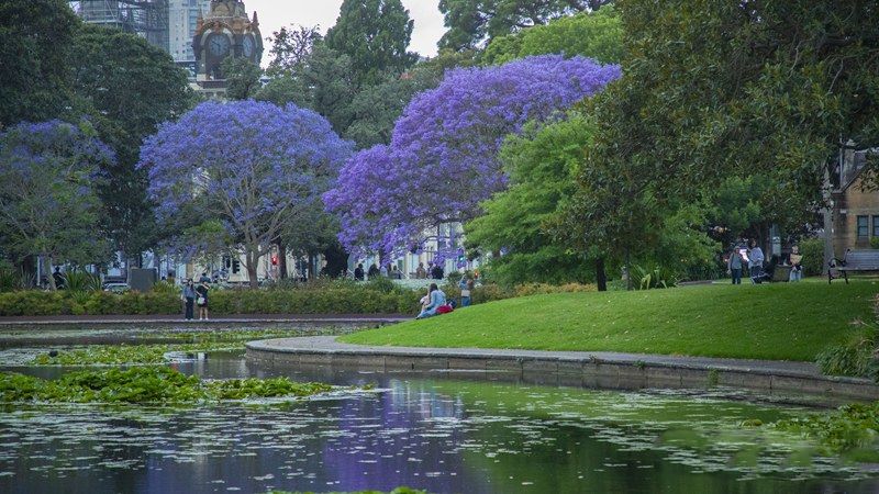 图为在澳大利亚悉尼,蓝花楹盛开,民众驻足观赏。(人民网)