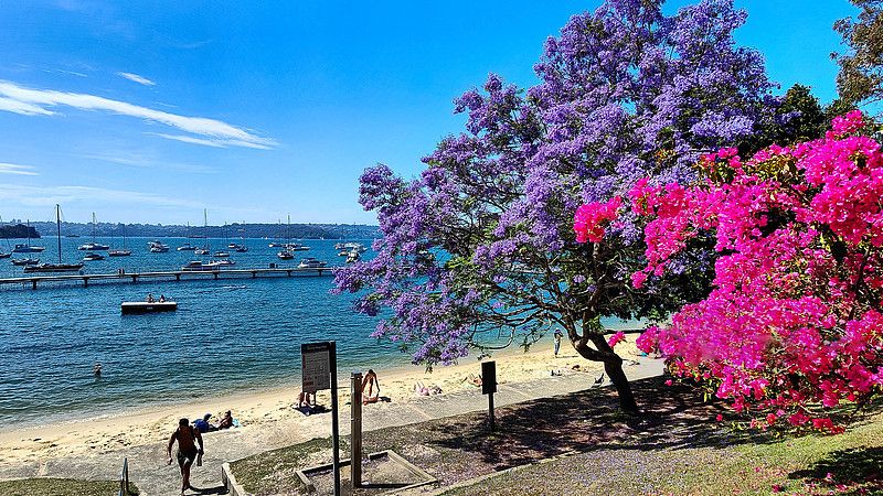 图为在澳大利亚悉尼,高档住宅区的海边沙滩,蓝花楹的紫色花朵开满树冠,碧蓝海面上点缀众多游艇,游人们前来晒日光浴吹海风,尽享初夏美景。(CFP)