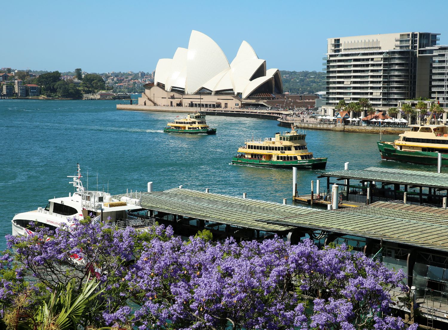 图为在澳大利亚悉尼歌剧院对岸拍摄的盛开的蓝花楹。(新华社)