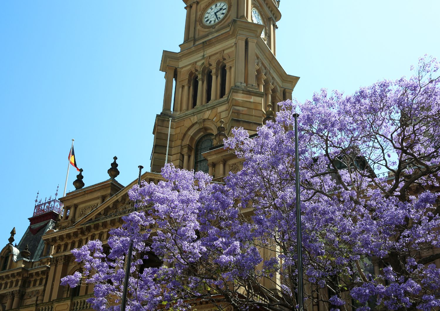 图为在澳大利亚悉尼市政厅门口拍摄的盛开的蓝花楹。(新华社)
