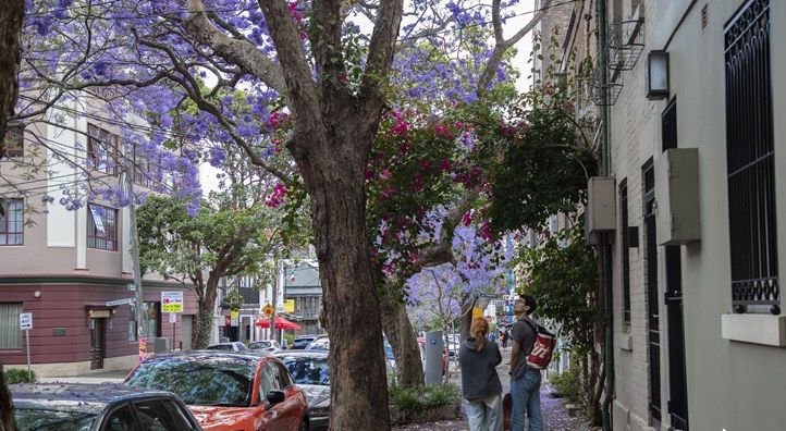 图为在澳大利亚悉尼,蓝花楹盛开,民众驻足观赏。(CFP)