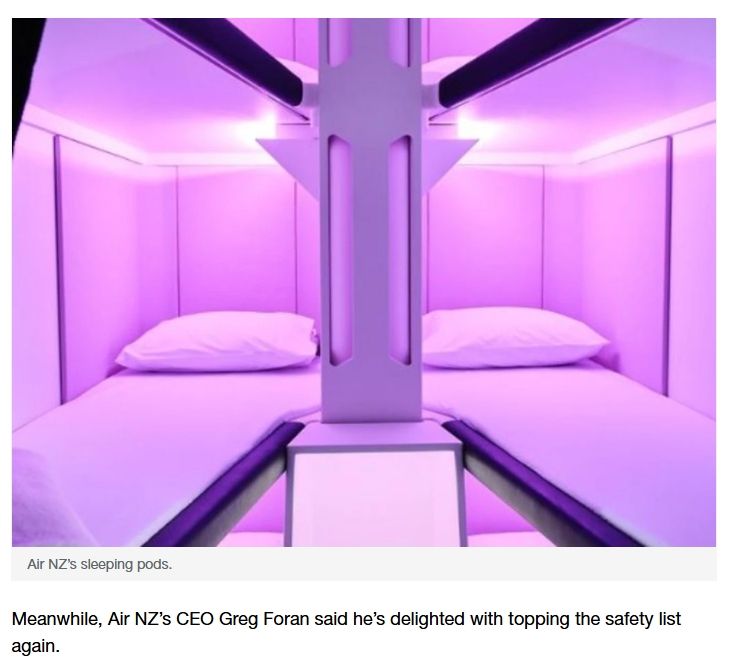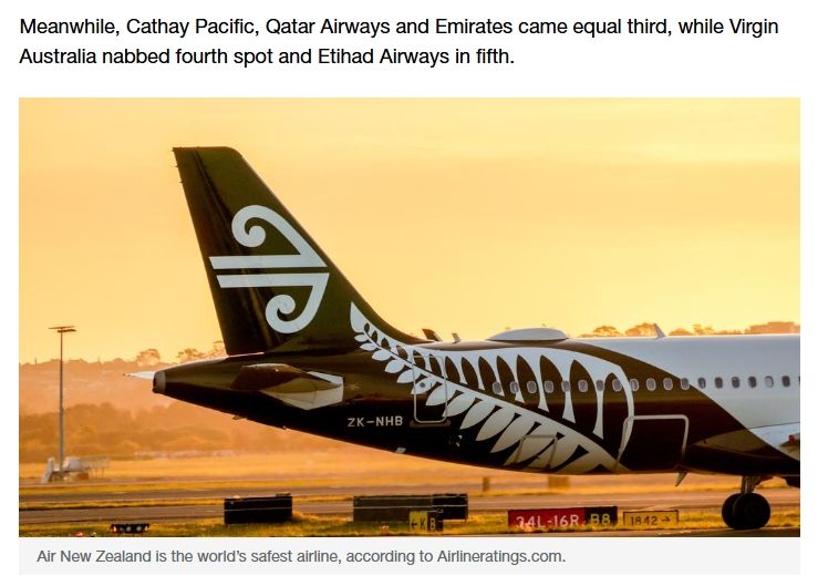 与此同时,新西兰航空首席执行官弗兰(Greg Foran)表示,他很高兴看到新西兰航空首再次荣登安全榜首。他在一份声明中表示:“我为整个新西兰航空集团感到非常自豪,因为我们始终如一地、勤勉地将安全放在我们所做的一切工作的首位。”