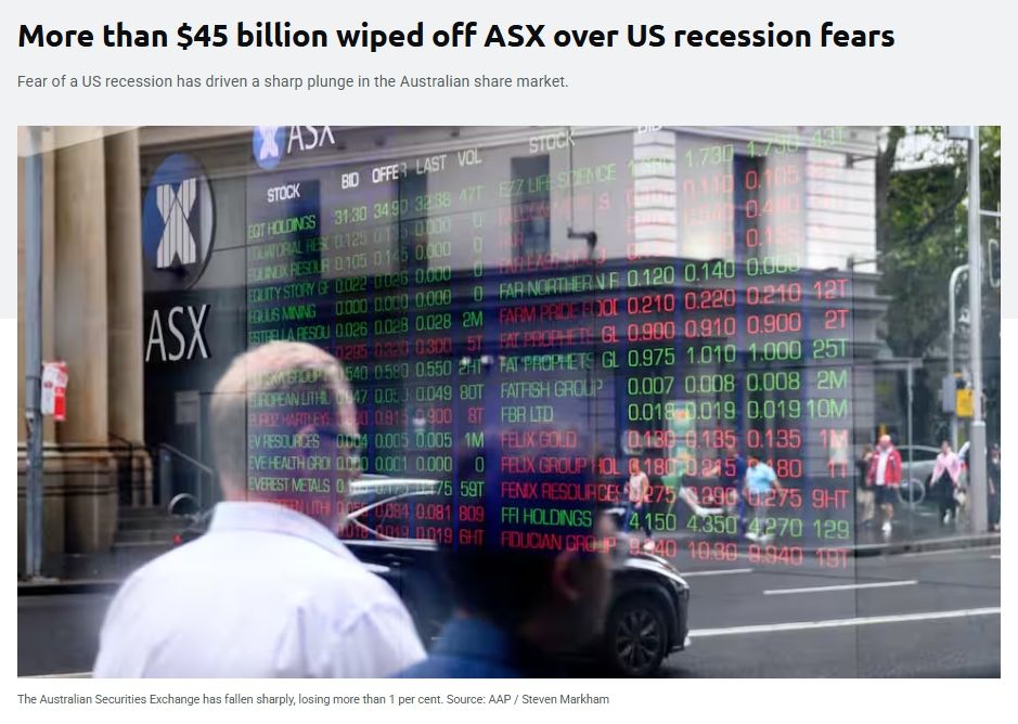 对美国经济衰退的担忧,正在导致澳大利亚股市大幅下挫。