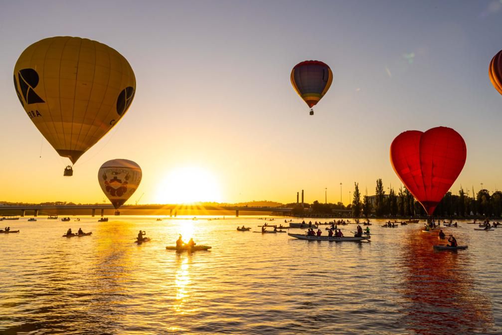 3月18日,热气球在澳大利亚堪培拉的伯利·格里芬湖上空飞行。(新华社)