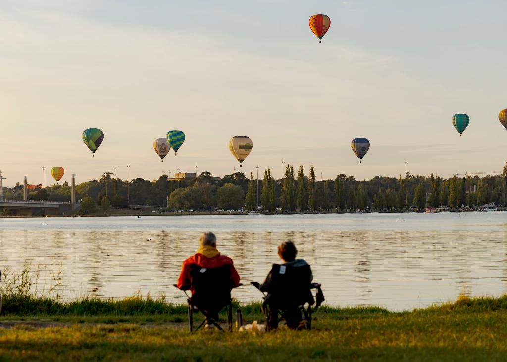 图为人们在澳大利亚堪培拉的伯利·格里芬湖畔观赏热气球。(新华社)