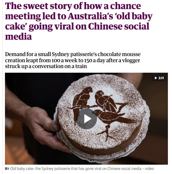 在一位中国视频博主麦克斯·李(Max Li)在火车上与玛吉(Margie)攀谈后,悉尼一家小糕点店的巧克力慕斯蛋糕的需求量从每周100个跃升至每天150个。