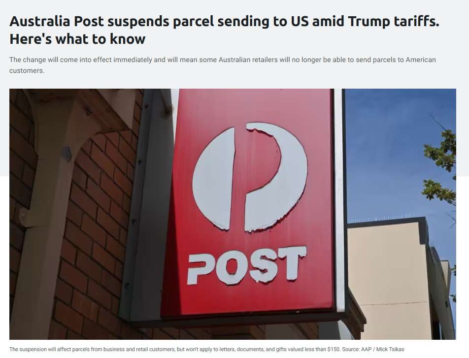 据悉,澳大利亚企业仍可通过敦豪(DHL)、联邦快递(FedEx)等费用更高的商业物流渠道向美国寄送包裹,但这对许多澳大利亚企业而言可能并不可行——已有多家企业宣布立即暂停向美国及波多黎各地区发货。