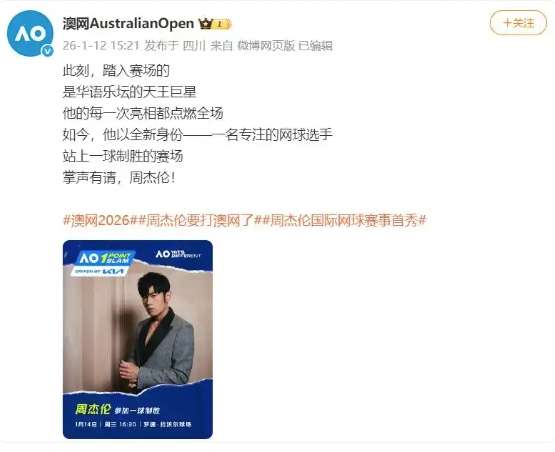 1月12日,@澳网AustralianOpen正式官宣:著名网球爱好者周杰伦将参加澳网“一球制胜”挑战赛(1point slam),这也是周杰伦国际网球赛事首秀。该赛事1月14日举行。