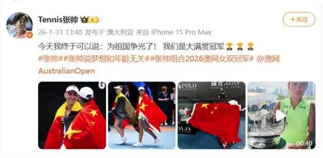 张帅赛后表示,时隔七年再次站在同样的领奖台,“很多记忆都回来了”。“我为我们两个人付出的努力感到骄傲和自豪。”随后,@Tennis张帅发文,今天我终于可以说:为祖国争光了!我们是大满贯冠军。
