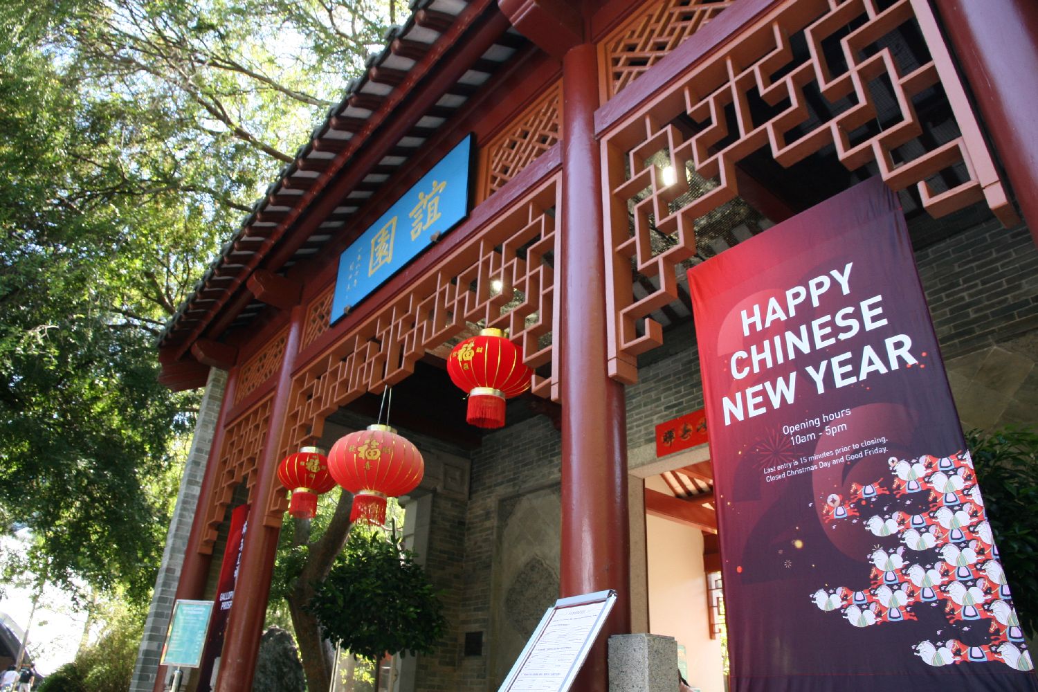 当天,谊园门口红灯高挂,张贴着春联“四海共欢除旧岁;五洲同庆迎新春”,横批为“共此春晖”。年味浓厚的装扮吸引过往路人驻足拍照,更有不少人入园探索。