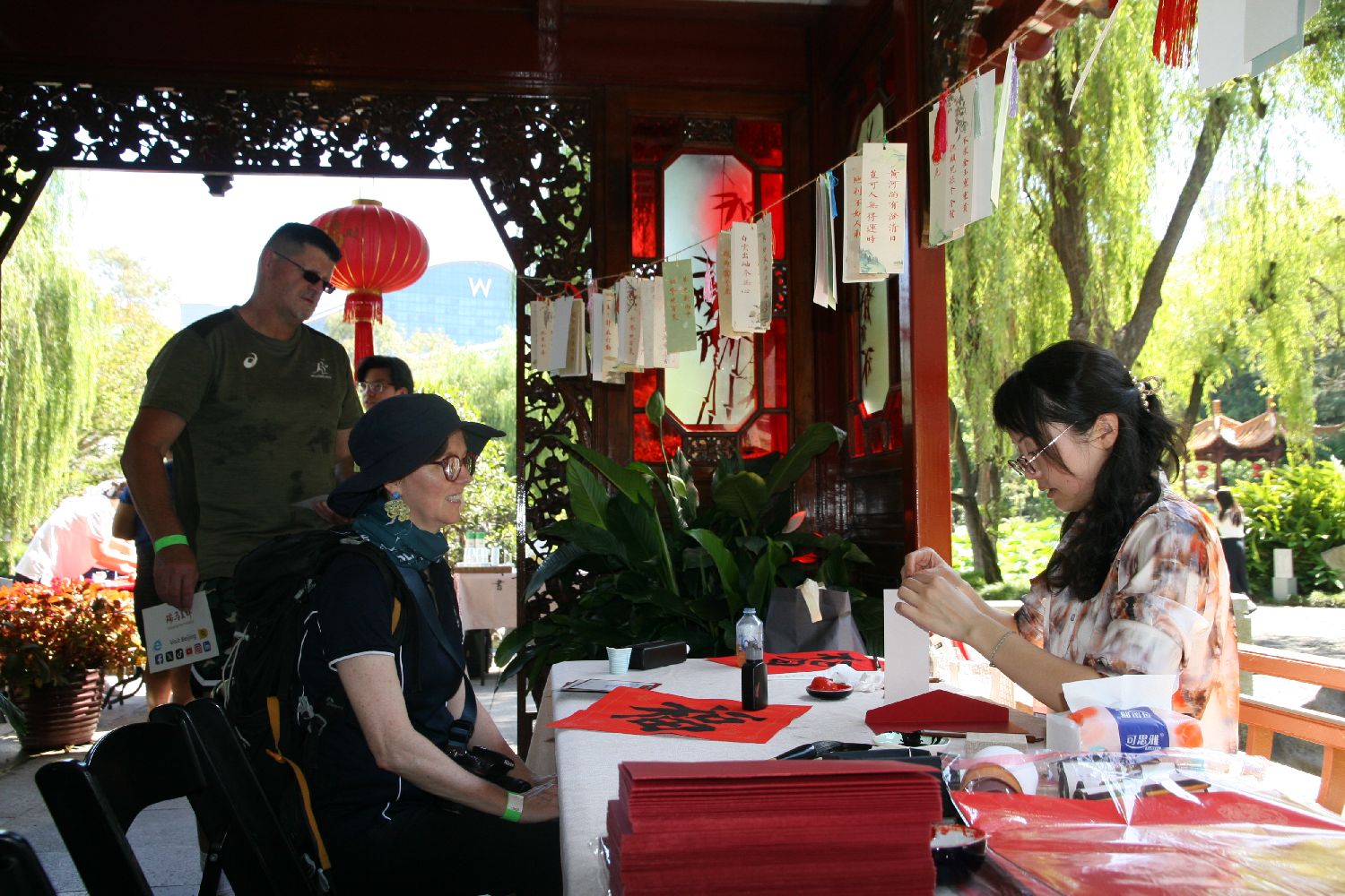 漫步于蜿蜒曲折的小径,游园会活动在亭台楼阁之中设置了多处非物质文化遗产代表性项目展示与互动体验摊位,参与者可与专业人士面对面交流,体验风筝制作、吹糖人、剪纸、书法、茶艺、拓印等项目,并收集刻有长城、故宫、天坛等北京地标图案的印章。
