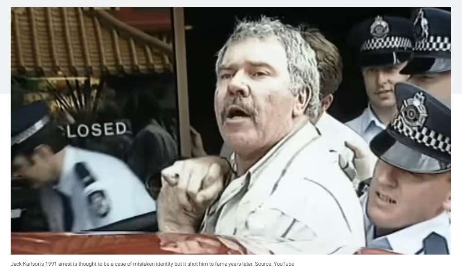 “先生们!这就是民主的体现!指控是什么?吃顿饭吗?吃一顿多汁的中餐?”1991年在布里斯班的一家中餐馆外,名叫杰克·卡尔森的男子因涉嫌盗用信用卡而被警察逮捕,面对正在拍摄的媒体记者,卡尔森仿佛“戏精上身”,说出了多年后成为热梗的这段话。