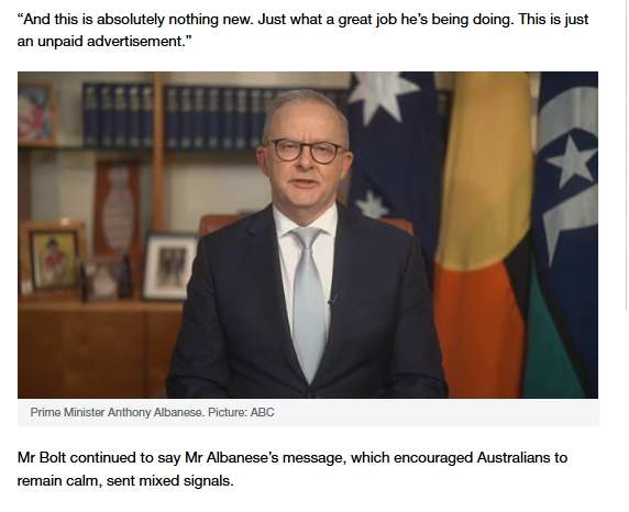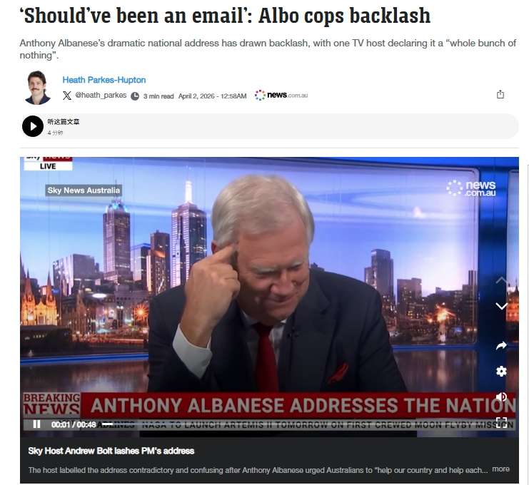 演讲播出后迅速引发强烈反对和嘲讽。天空新闻主持人博尔特(Andrew Bolt)在节目中直言,这场演讲“完全是一场空”,相当于政府的“免费广告”。“总理大张旗鼓地宣布全国演讲,所有人都被迫观看,结果没有任何新内容,只在吹嘘自己做得多好,这就是一场无偿宣传。”博尔特还指出,演讲内容存在矛盾——既让民众“正常生活、无需改变”,又呼吁“节省燃油”,传递的信号混乱不清。