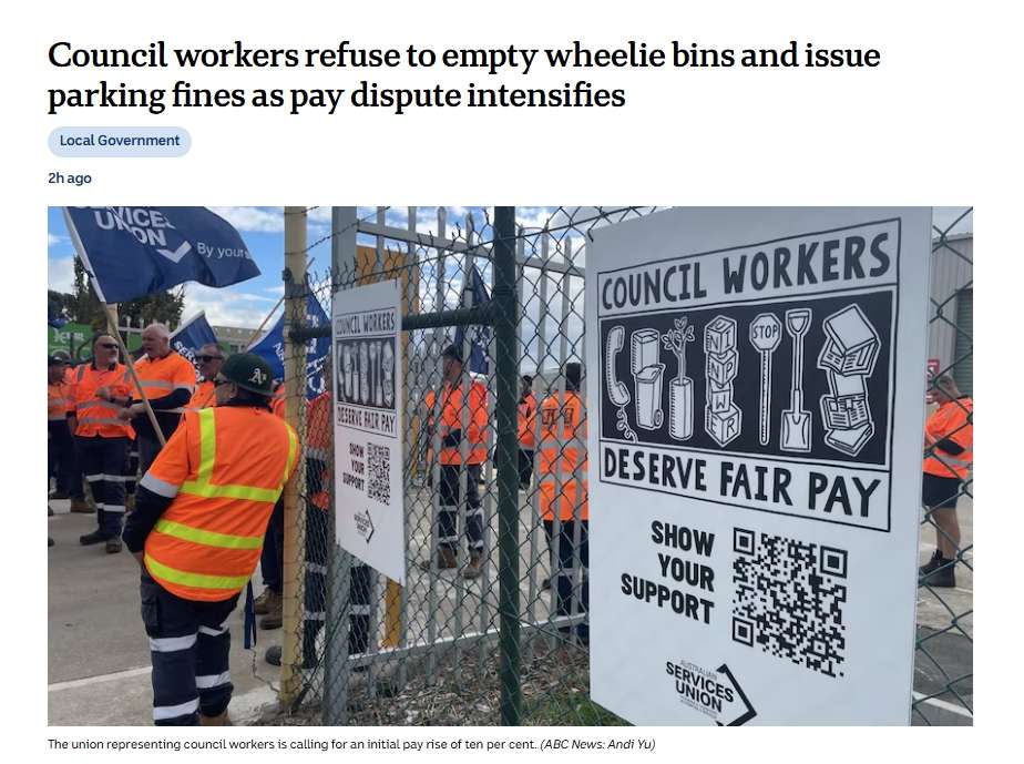 墨尔本多个辖区的市政工人因薪资纠纷发起罢工行动,宣布暂停垃圾清运和停车罚单开具工作,此次罢工由澳大利亚服务业工会(ASU)牵头,已影响墨尔本多个城区的公共服务,工会方面还表示不排除进一步扩大罢工范围。