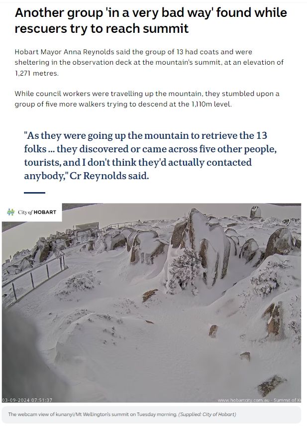 霍巴特市长雷诺兹(Anna Reynolds)表示,救援人员试图到达山顶时,发现这13人穿着外套,躲在山顶海拔1271米的观景台上。