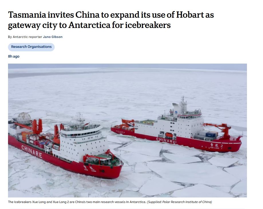 据悉,在新冠疫情暴发之前,中国两艘主要极地科考船“雪龙”号和“雪龙2”号在前往南极洲的途中会定期在霍巴特港口停靠,为塔斯马尼亚州带来了可观的收入。