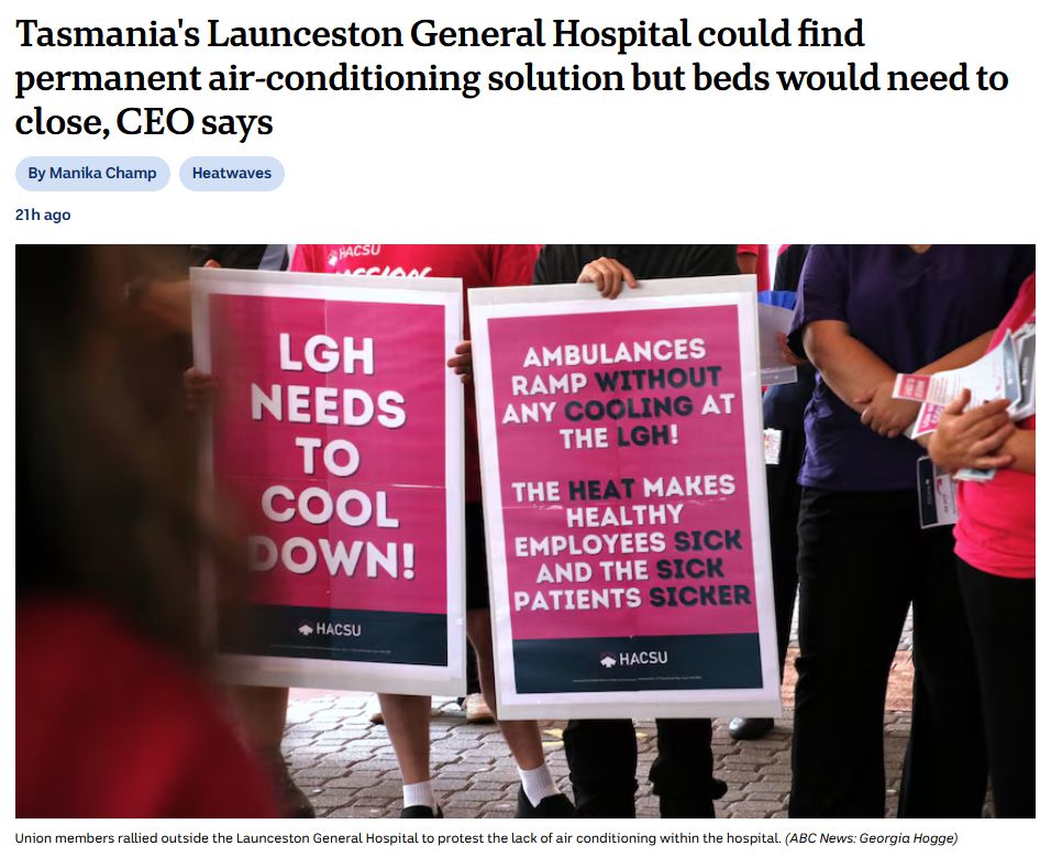 空调问题并非新出现的问题——医院工会多年来一直呼吁改善温控状况,而塔斯马尼亚州目前正处于热浪之中,朗塞斯顿连续多日气温超过30°C。