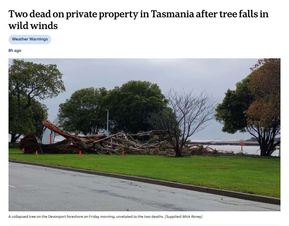 根据最新消息,警方表示,在塔斯马尼亚州西北部的一处乡村房产,因遭遇强风与阴雨天气,已造成两人死亡。(编译文章来源:澳广网)