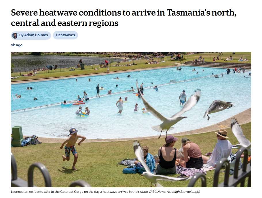 “高温是由一股热气团引起的,然后一些西北风将部分热空气吹向我们塔斯马尼亚。”预计气温将于9日左右恢复正常,随后10日将有一股冷锋来袭。