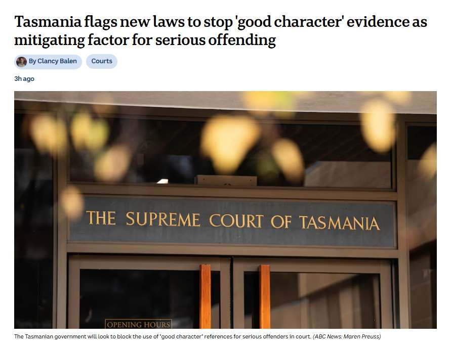 塔斯马尼亚州政府近日表示,将考虑立法,禁止罪犯在所有重罪案件中,以“品行良好(good character)”相关证明作为从轻量刑的依据。
