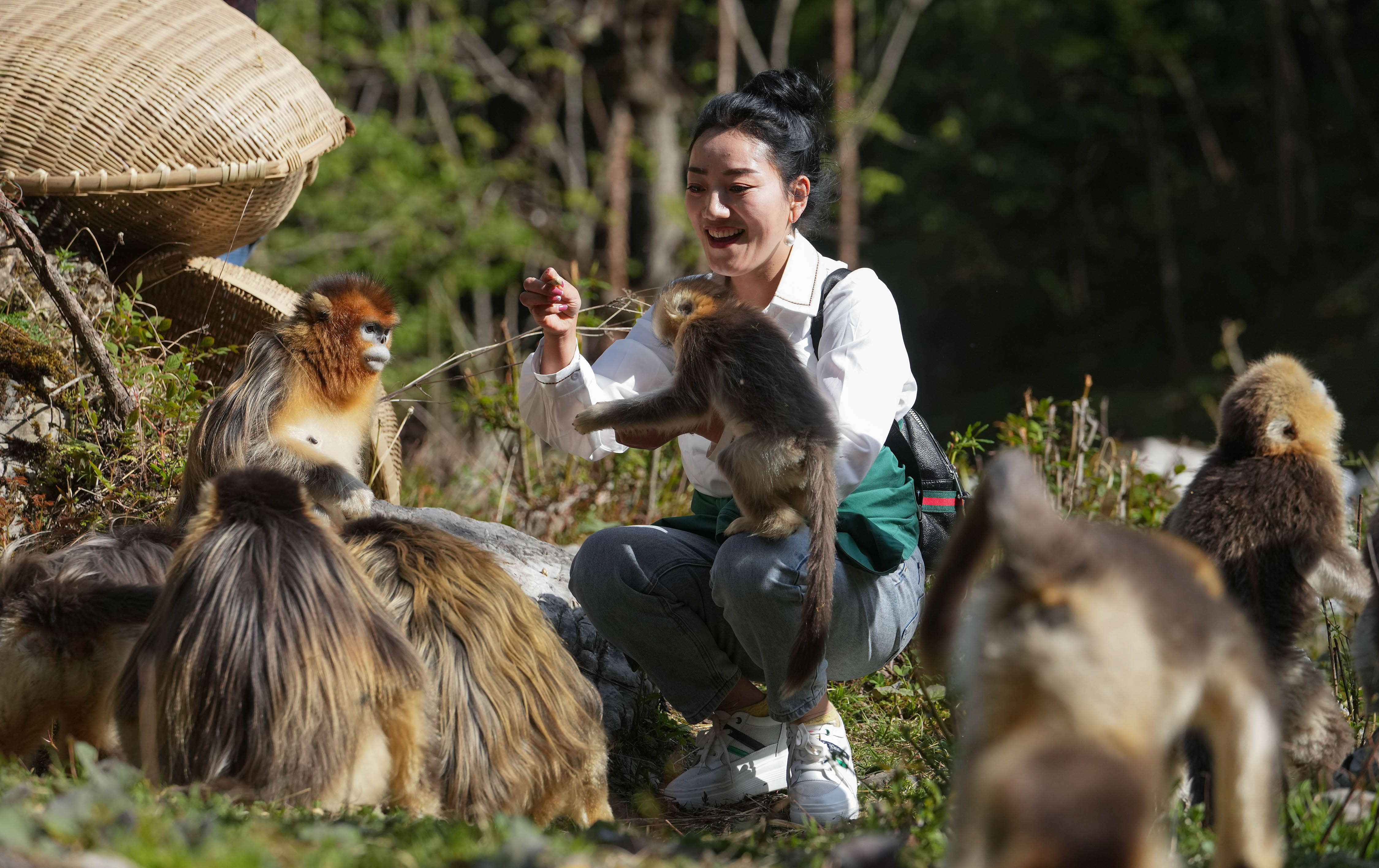 26日,在四川白河国家级自然保护区里,工作人员与川金丝猴在一起。(新华社)