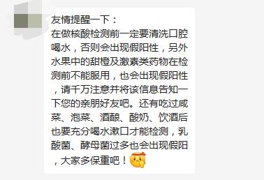 “做核酸前不喝水漱口,吃水果、泡菜,喝碳酸饮料、酒,都容易假阳性。”近日,有不少人收到了这样的一条“提示”。