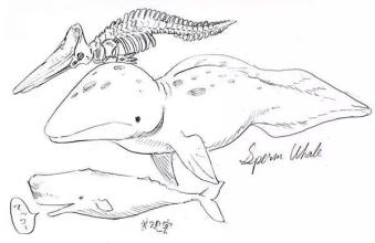 ↑从上到下,分别是抹香鲸的骨架、“未来人类的想象复原图”、和真实的抹香鲸。