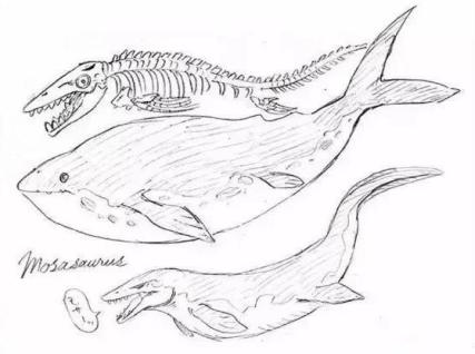 由上至下:沧龙骨骼,漫画家想象出的沧龙,科学家复原出的沧龙。到底哪个对呀??