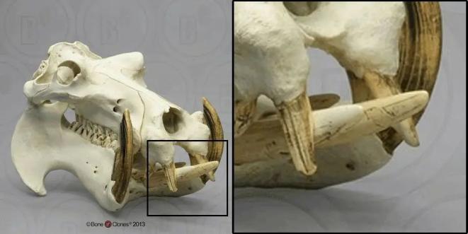当我们带着这样的结论去看河马的时候,有些东西就变得显而易见了:门齿和嘴唇紧密摩擦的部分已经光滑,但是犬齿的唇面纹理还在。如果说门齿外侧的光滑还能说是上下门齿摩擦的结果,那么内测的光滑几乎就可以判定是来自舌头和嘴唇共同的摩擦了。