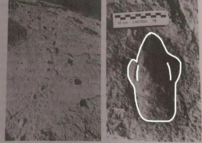 坦桑尼亚利特里地区保留的三趾马行进脚印化石。