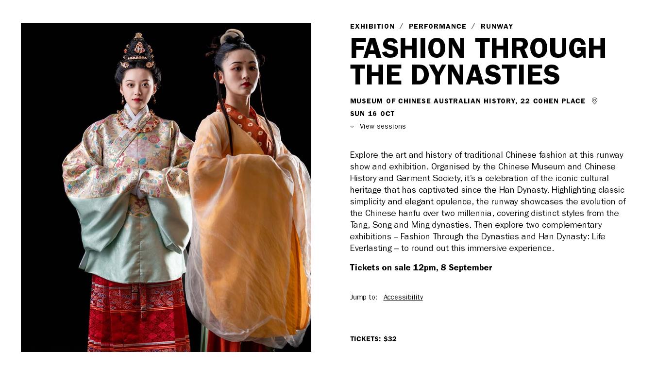 “在这个秀场和展览中探索中国传统服装的艺术和历史,是对自对中国汉代以来就备受瞩目的标志性文化遗产的庆祝。秀场展示了中国汉服两千多年来的演变历程,突显经典的简约与优雅的富丽,涵盖了唐、宋、明三朝的不同风格。汉服,在由注重时尚的中国年轻人的努力下,在墨尔本再现。”