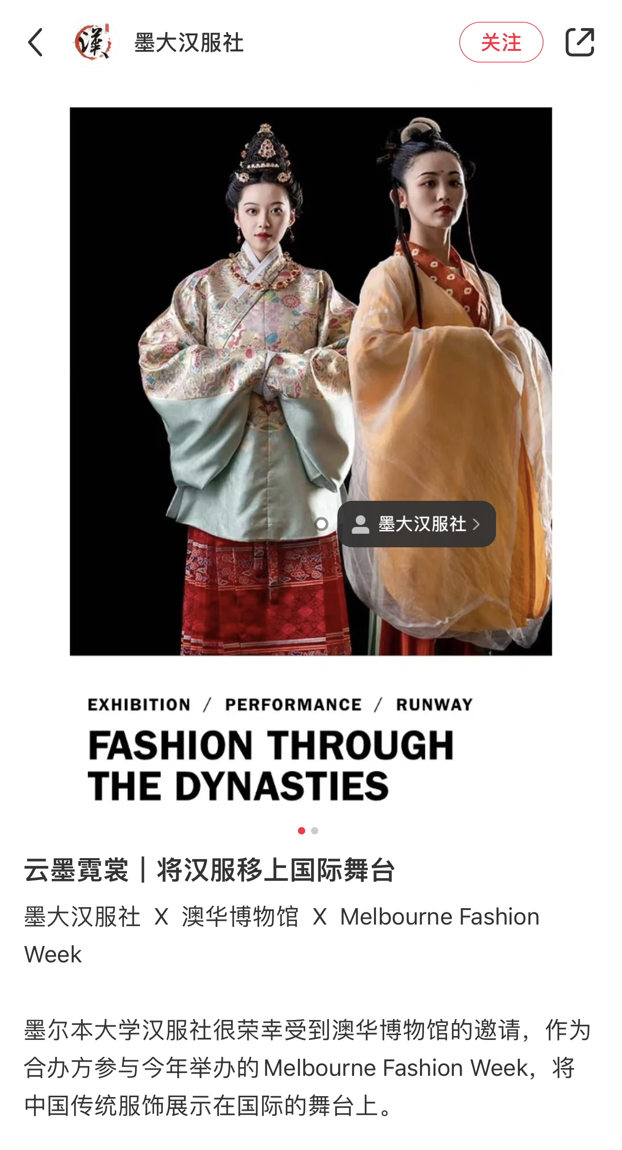 这是汉服首次出现在墨尔本国际时装周上,这个消息同样也让华人圈“沸腾”了。