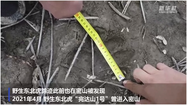 “东北虎的足迹跟其他野生动物不一样,它的前爪在行走过程中是收回的。”密山市林业和草原局工作人员王兴顺说,工作人员到现场测量足迹,并把照片发给野生动物专家鉴定,确定为东北虎足迹。