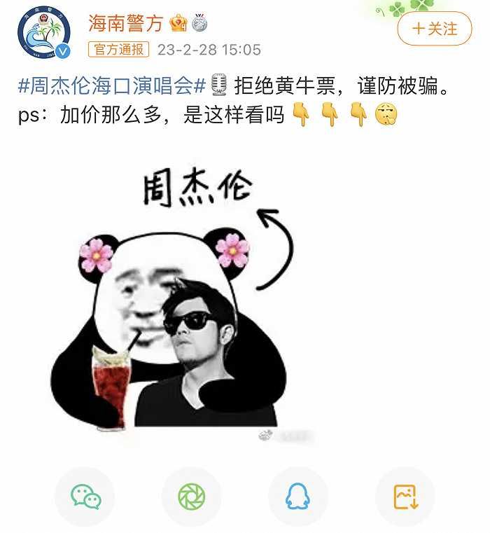 2月28日下午,海南警方在#周杰伦海口演唱会#此条下发布微博,提醒观众拒绝黄牛票,谨防被骗,通过官方网站购买演唱会门票。