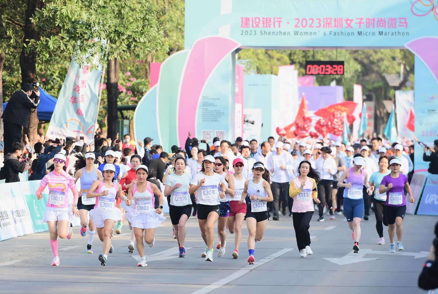 “三八”国际妇女节即将来临,3月5日,建设银行·2023深圳女子时尚“微马”在中国深圳龙华大浪时尚小镇闪耀开跑,女性跑步爱好者在跑道上展现新时代女性风采。