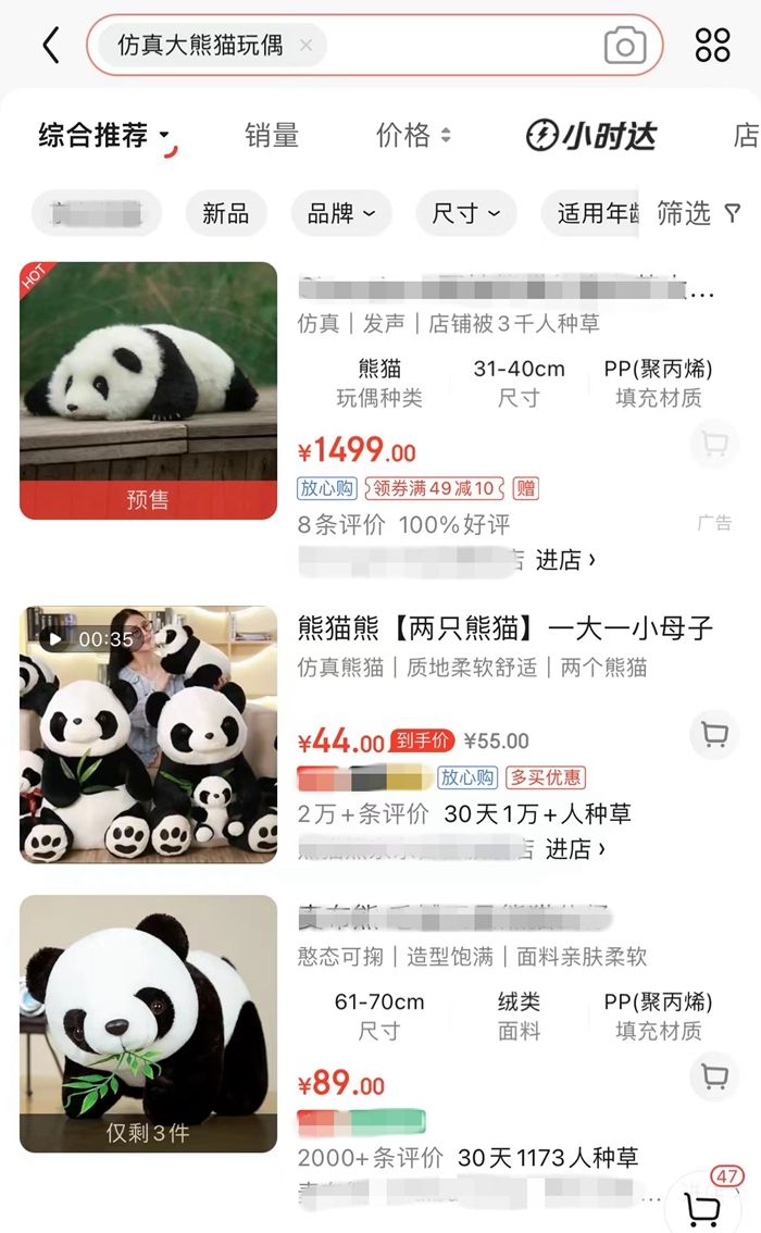 媒体在多个电商平台观察,目前仿真大熊猫玩偶价格参差不齐,从几十元(人民币,下同)到几千元的都有。相较于传统的熊猫造型毛绒玩具价格只有几十元,仿真大熊猫玩偶价格动辄上千,且销量一直不错。