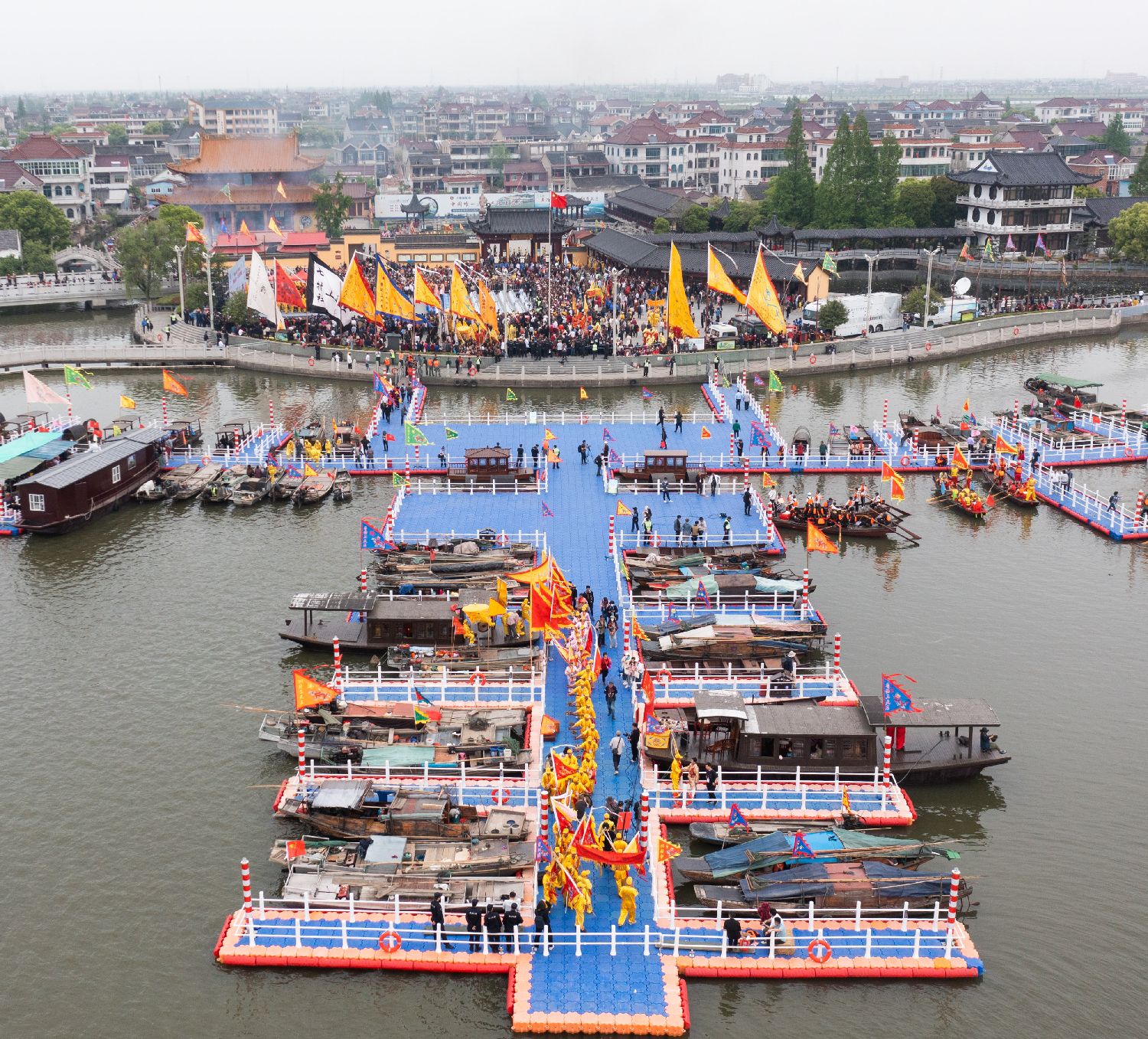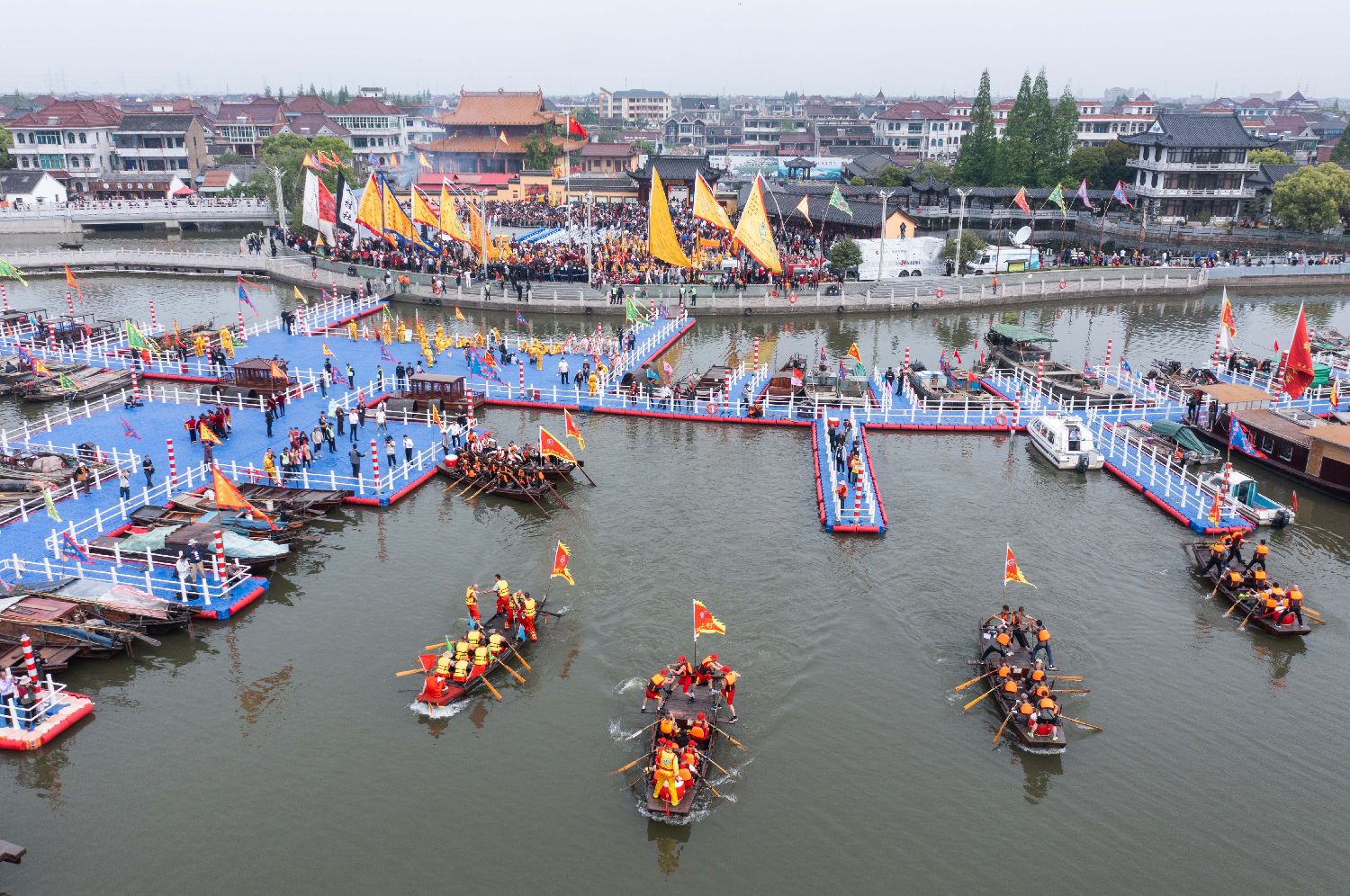 网船会起源于清末民初,是当地渔民自发组织的原生态民俗祭祀活动。百余年来,江南网船会已成为渔民、船民自己的盛大节日,2011年被中国政府列入国家级非物质文化遗产名录。图为4月18日,空中俯瞰王江泾镇莲泗荡的网船会现场。(新华社)