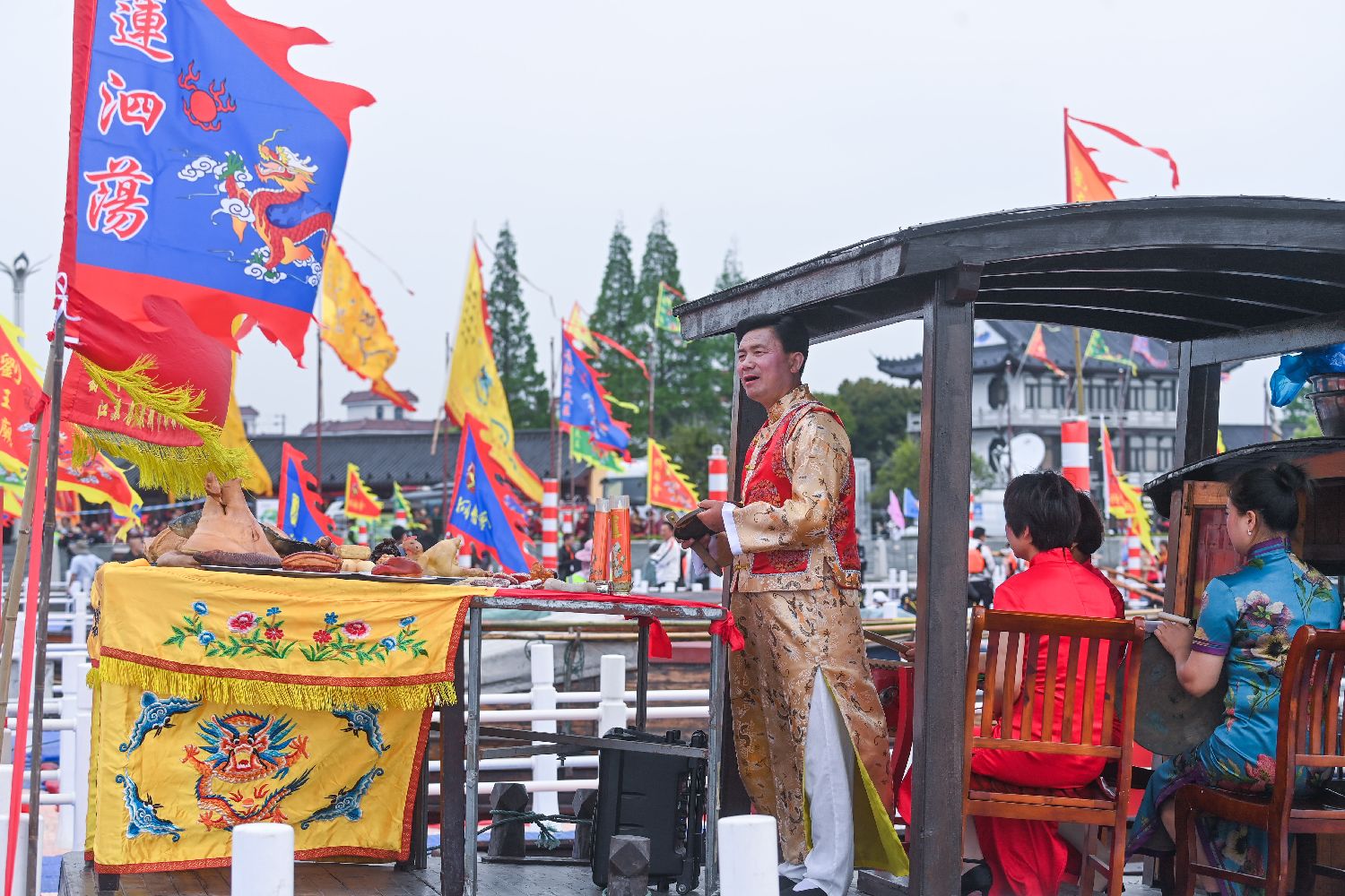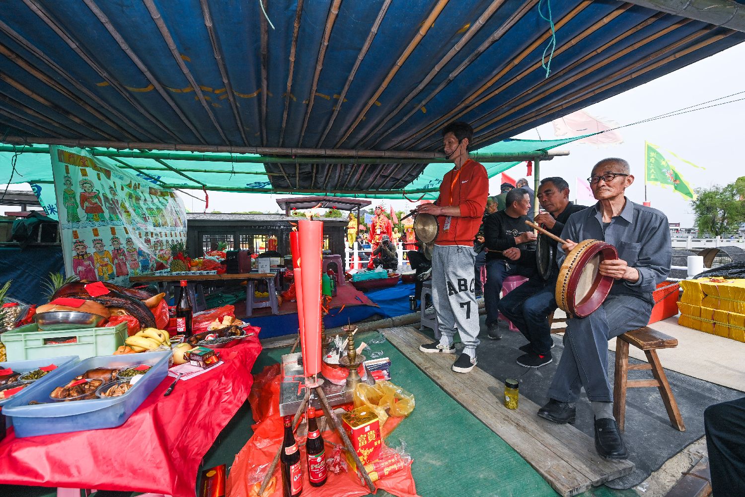 4月18日,民俗艺人在王江泾镇莲泗荡的网船会现场表演。(新华社)