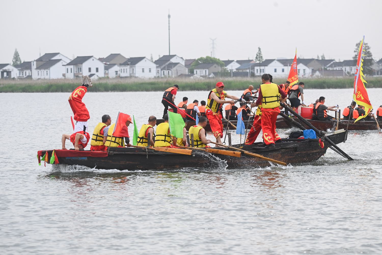 4月18日,大型民俗活动中国江南网船会在浙江省嘉兴市秀洲区王江泾镇莲泗荡风景区举办,江浙沪一带渔民、船民纷纷驾船前来赶庙会,呈现一场“水上民俗盛宴”。图为4月18日,传统踏白船表演在王江泾镇莲泗荡的网船会现场举行。(新华社)