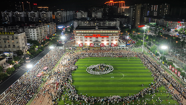 6月的贵州省黔东南苗族侗族自治州榕江县县城,和天气一样火热的还有足球比赛。图为6月10日晚,比赛中场休息时的侗族大歌表演。